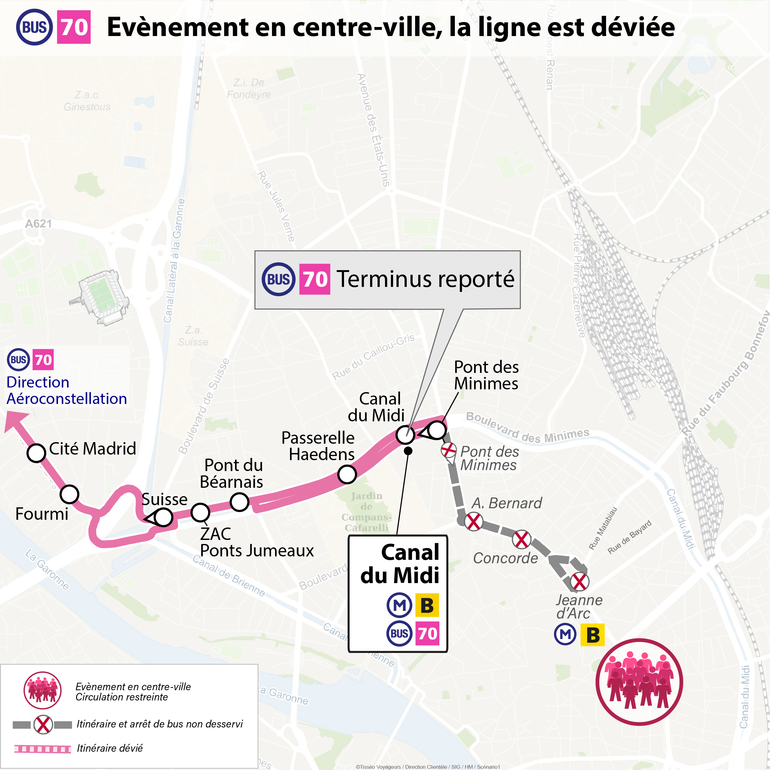 Le terminus"Jeanne d'Arc" est reporté à l'arrêt Canal du Midi direction Aéroconstellation (correspondance ligne B du métro).