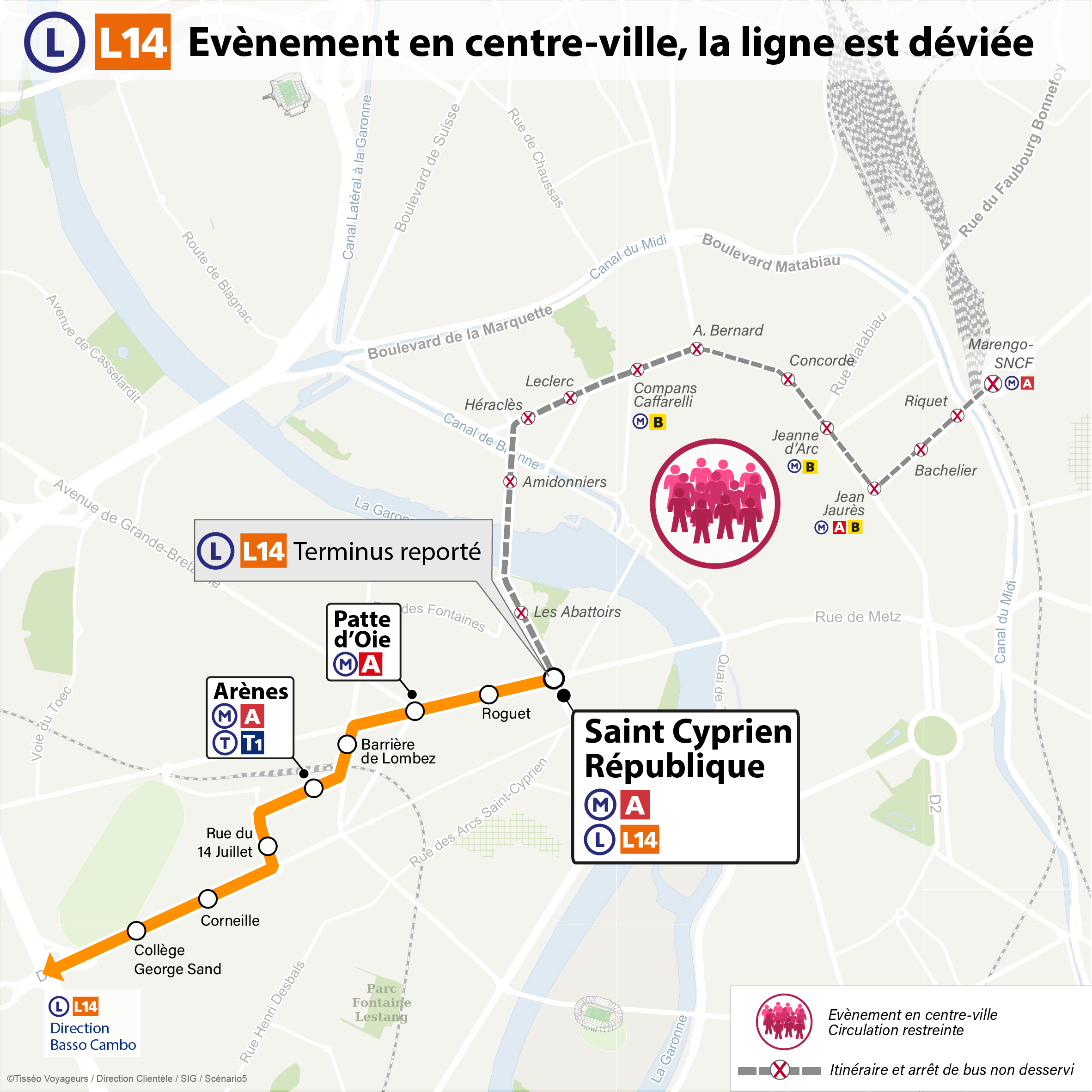 Le terminus Marengo-SNCF est reporté Place Intérieure Saint Cyprien (correspondance ligne A du métro).