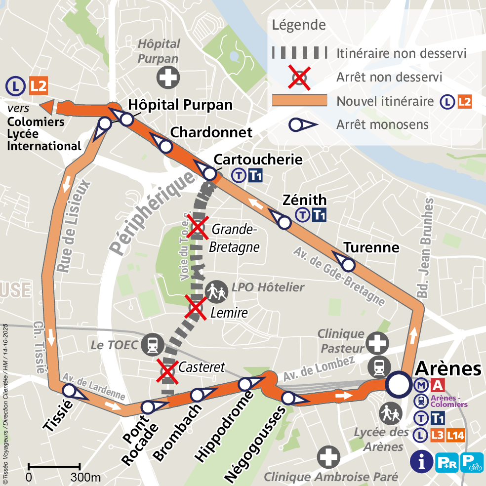 A compter du lundi 3 novembre 2025, l'itinéraire de la ligne L2 est modifié direction Arènes.