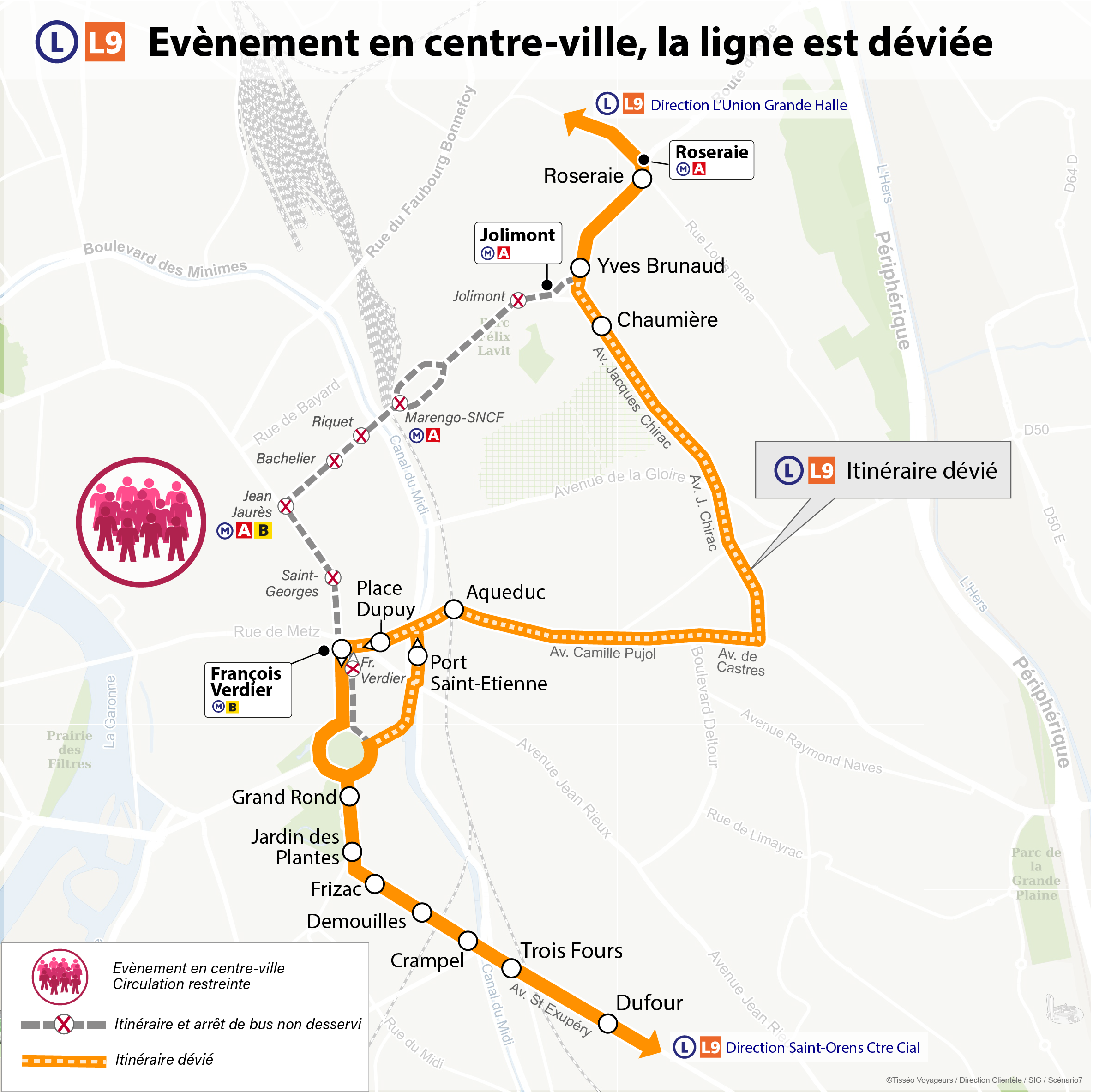 A compter du samedi 13 décembre 2025, la ligne L9 retrouve son itinéraire par la rue du Faubourg Bonnefoy.