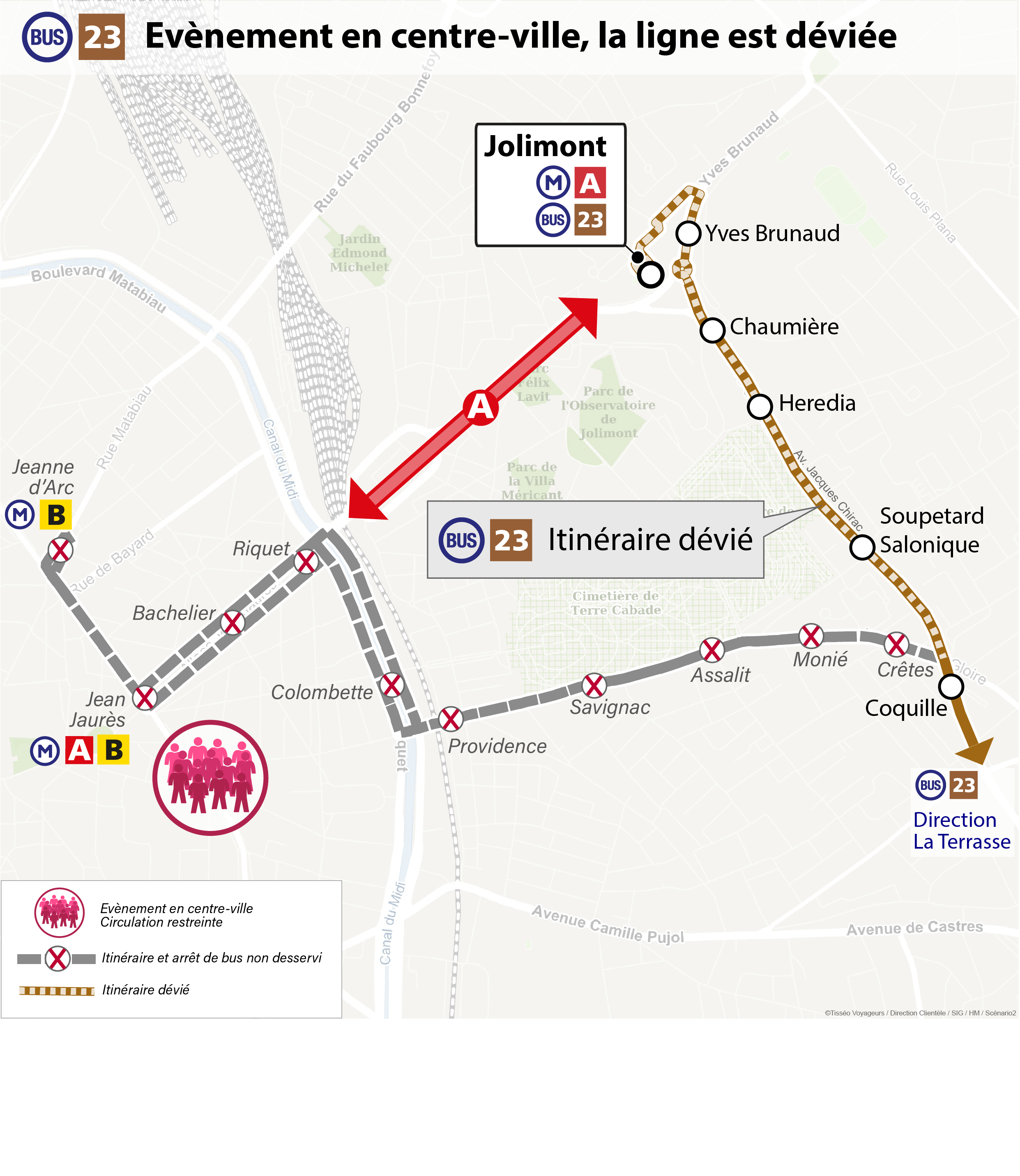 Numéro de ligne23Jeanne d'Arc / La Terrasse Fiche horaire bus 23 PDF fichier PDF - 372.29 Ko Fiche horaire bus 23 HTML fichier autre - 1.01 Mo Informations (1) dernière mise à jour à 08:01 🟠 Déviation ligne 23 : manifestation du 29/11/2025 Le samedi 29 novembre à partir de 13h30 : déviation ligne 23. ❌ Arrêts non desservisCrêtesMoniéAssalitSavignacProvidenceColombetteRiquetBachelierJean JaurèsJeanne d'Arc ✔️ Solutions de déplacement Le terminus "Jeanne d'Arc" est reporté à Jolimont (correspondance ligne A du métro).📎 Pièce jointe Plan de la déviation 📣 Manifestation au centre-ville de Toulouse Pour préparer votre déplacement ou consulter les prochains passages, pensez au plan interactif. Plan déviation ligne 23.png