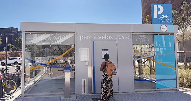 Il est nécessaire de poser le pied à terre pour les vélos et les trottinettes, dès l’arrivée dans la station.
