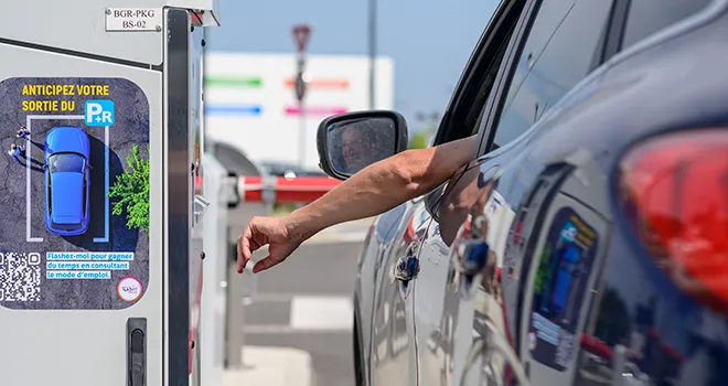 - En sortie : présentez votre carte de transport ou votre ticket parking puis votre titre de transport (ticket rechargeable, carte bancaire ou carte de transport) pour bénéficier de la gratuité des parcs relais.