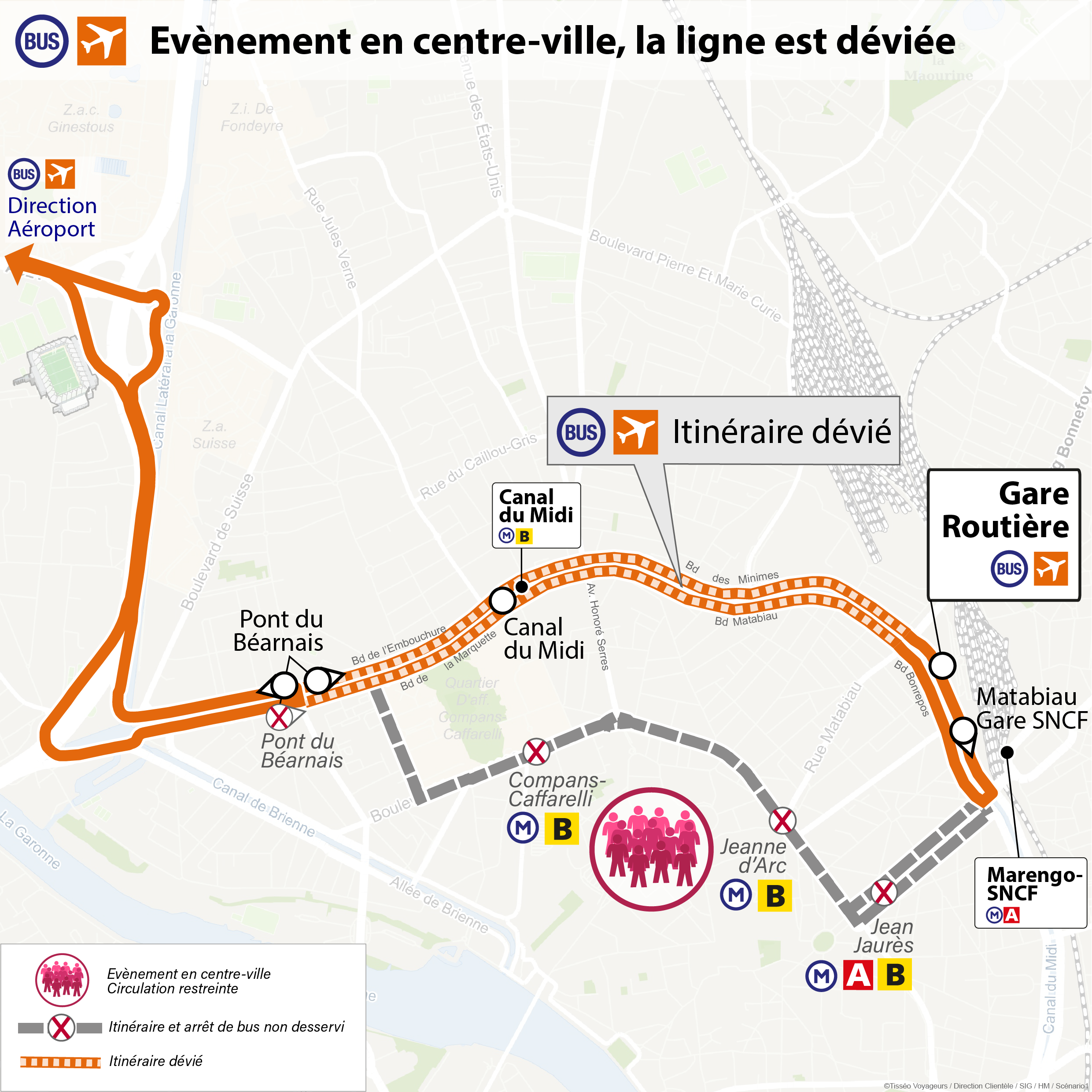 ✔️ Sur son itinéraire de déviation, une correspondance est possible avec la ligne B du métro à Canal du Midi.