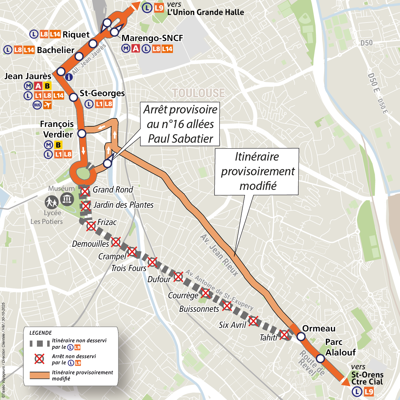 Du mercredi 19 au mercredi 26 novembre 2025, l'arrêt "Croix-Daurade" de la ligne L9 direction Saint-Orens Centre Commercial n'est pas desservi.